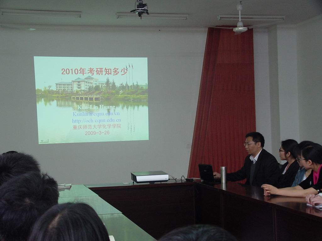 首先,黄坤林教授介绍了化学(师范)专业考研的相关情况,他以“2010考研知多少”为题,从考研目的、全国化学硕博授权点分布、研究生入学考试须知、如何备考四个方面进行了详细介绍。黄老师告诫大家要正确评估自己,明确目的,做到不患得患失、知已知彼、百战不殆。他幽默风趣的演讲博得了师生们的阵阵掌声。随后,曹静老师从科学教育专业考研的实际出发,介绍并分析了此专业的考研动态和硕士点分布。最后,在2009年考研取得优异成绩的三位05级的同学结合自身备考经验解答了师弟师妹们提出的种种问题和困惑。