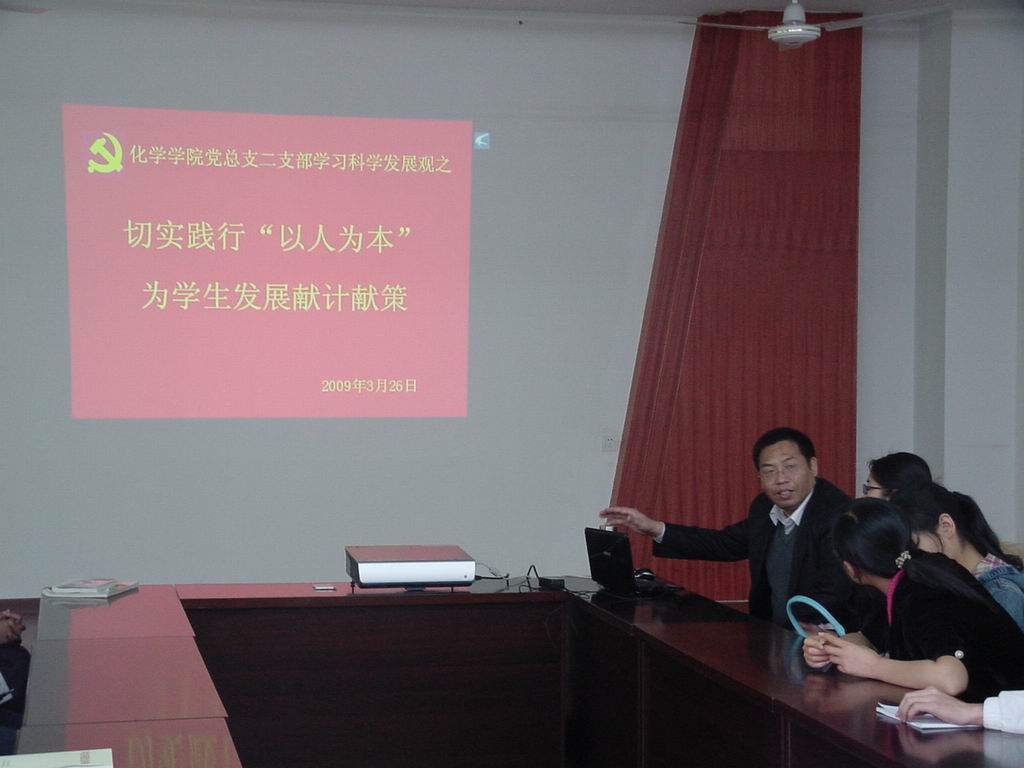 2009年3月26日中午12:40,化学学院党总支学生第二支部在实验大楼学术报告厅开展了以“切实践行‘以人为本’,为学生发展献计献策”为主题的深入学习实践科学发展观的活动。活动由院党总支副书记李荣教授主持,支部全体党员及各年级有考研意向的同学参加了此次活动。
