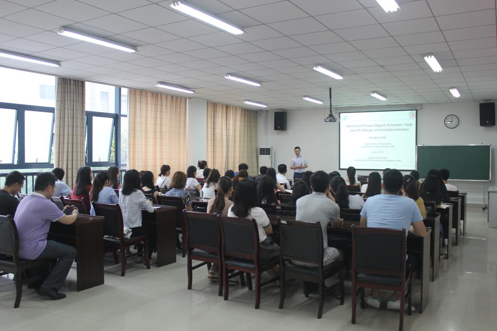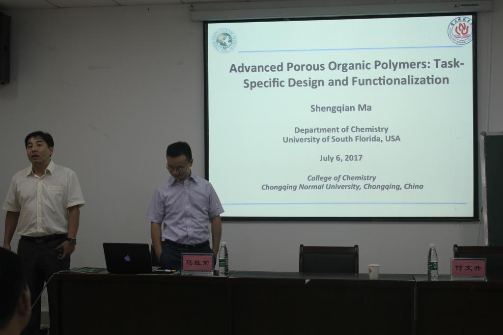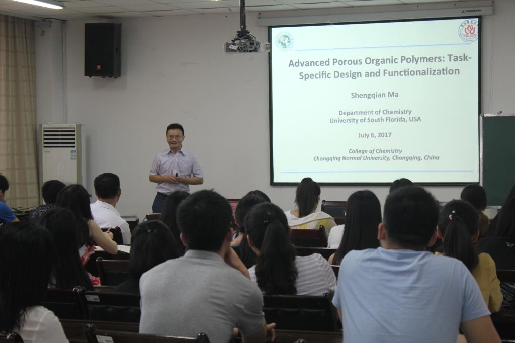 2017年7月6日上午9点,美国南佛罗里达大学(University of South Florida)马胜前教授应邀参加重庆师范大学化学学院学术交流会,交流会上马胜前教授作了题为Advanced Porous Organic Polymers: Task-Specific Design andFunctionalization的学术报告,就有机多孔聚合物(POPs)的特有框架结构、性质和应用方向等作了详细介绍。